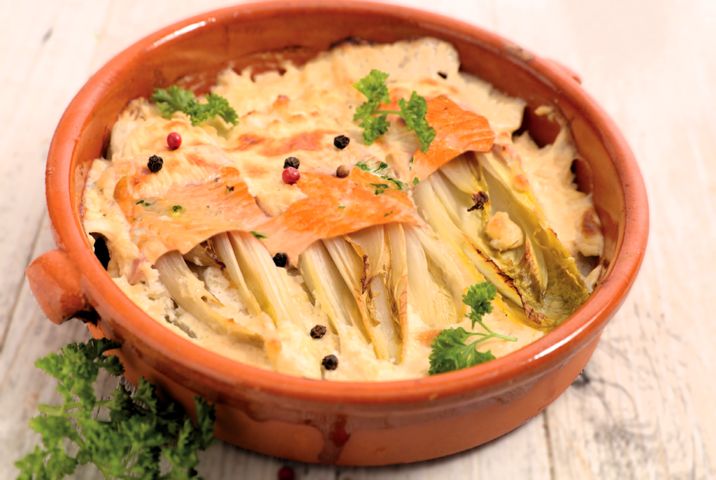 Enroulez chaque endive cuite d’une tranche de truite fumée.
