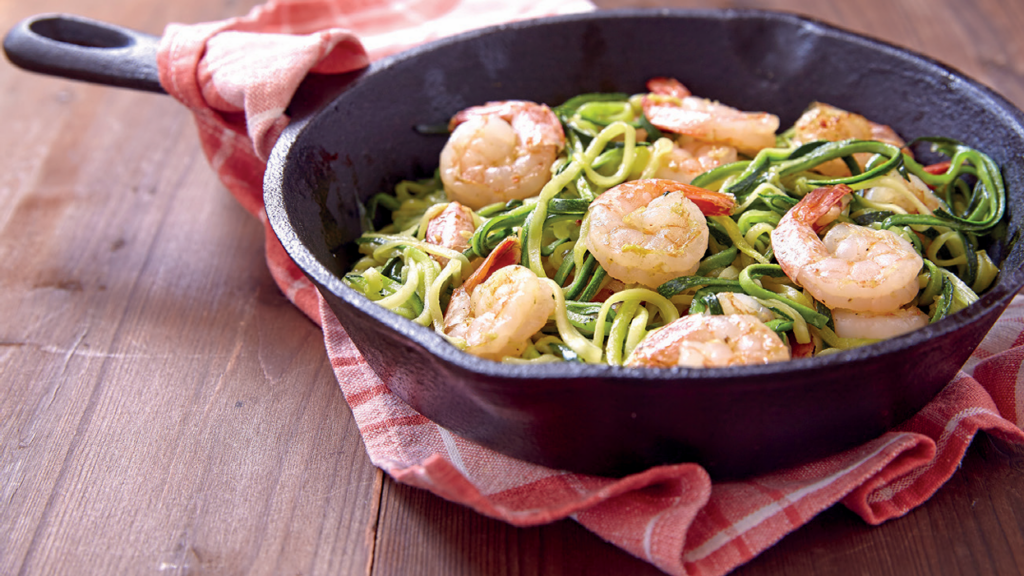 Gambas grillées nouilles de courgettes et de carottes à l’avocat